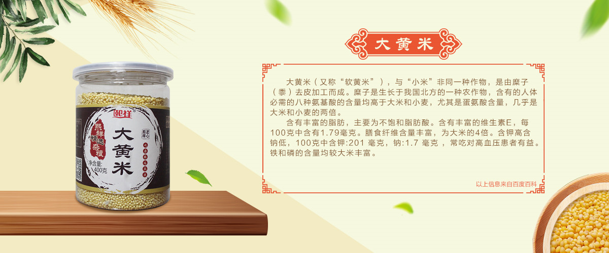 大黃米(又稱“軟黃米”),與“小米”非同一種作物,是由糜子(黍)去皮加工而成。糜子是生長(zhǎng)于我國(guó)北方的一種農(nóng)作物,含有的人體必需的八種氨基酸的含量均高于大米和小麥,尤其是蛋氨酸含量,幾乎是大米和小麥的兩倍。