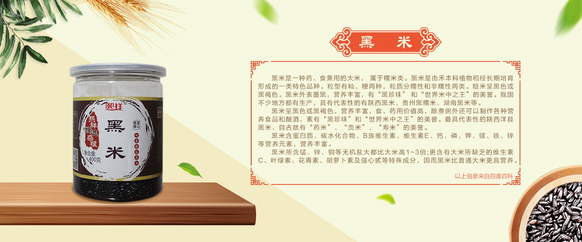 黑米是一種藥、食兼用的大米, 屬于糯米類。黑米是由禾本科植物稻經(jīng)長(zhǎng)期培育形成的一類特色品種。粒型有秈、粳兩種,粒質(zhì)分糯性和非糯性兩類。糙米呈黑色或黑褐色。黑米外表墨黑,營(yíng)養(yǎng)豐富,有“黑珍珠” 和“世界米中之王”的美譽(yù)。我國(guó)不少地方都有生產(chǎn),具有代表性的有陜西黑米、貴州黑糯米、湖南黑米等。