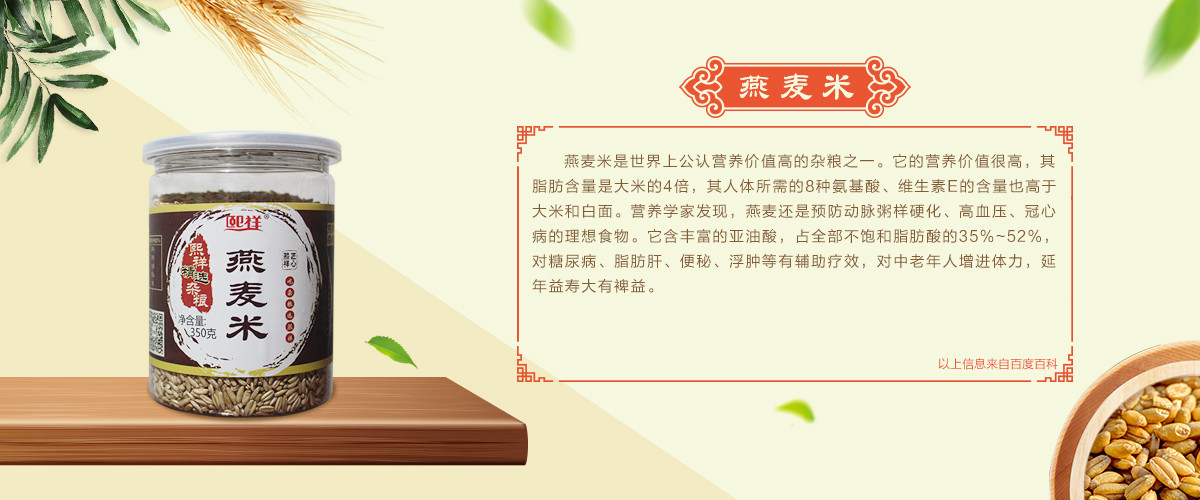 燕麥米是世界上公認營養(yǎng)價值高的雜糧之一。它的營養(yǎng)價值很高,其脂肪含量是大米的4倍,其人體所需的8種氨基酸、維生素E的含量也高于大米和白面。營養(yǎng)學家發(fā)現(xiàn),燕麥還是預防動脈粥樣硬化、高血壓、冠心病的理想食物。它含豐富的亞油酸,占全部不飽和脂肪酸的35%~52%,對糖尿病、脂肪肝、便秘、浮腫等有輔助療效,對中老年人增進體力,延年益壽大有裨益。(以上信息來自百度百科)
