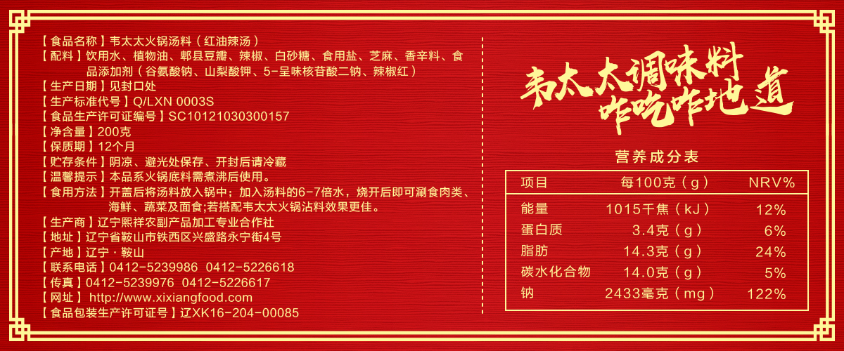 飲用水、植物油、郫縣豆瓣、辣椒、白砂糖、食用鹽、芝麻、香辛料、食品添加劑(谷氨酸鈉、山梨酸鉀、5-呈味核苷酸二鈉、辣椒紅)