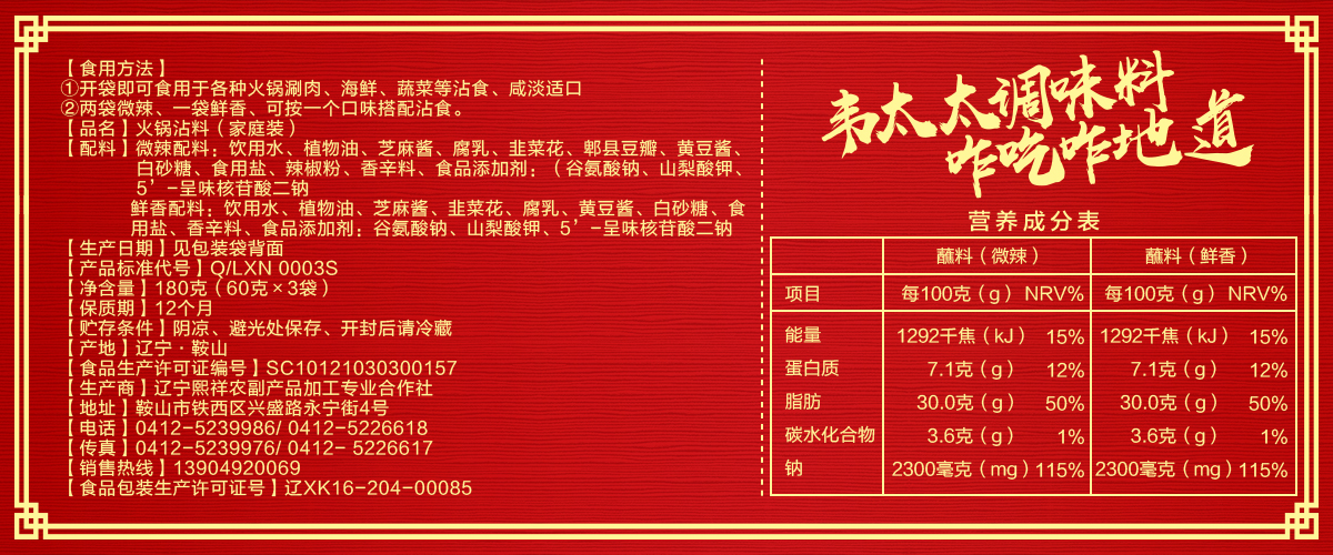 微辣配料:飲用水、植物油、芝麻醬、韭菜花、腐乳、郫縣豆瓣、黃豆醬、白砂糖、食用鹽、辣椒粉、香辛料、食品添加劑(谷氨酸鈉、山梨酸鉀、5-呈味核苷酸二鈉) 鮮香配料:飲用水、植物油、芝麻醬、韭菜花、腐乳、黃豆醬、白砂糖、食用鹽、香辛料、食品添加劑(谷氨酸鈉、山梨酸鉀、5-呈味核苷酸二鈉)