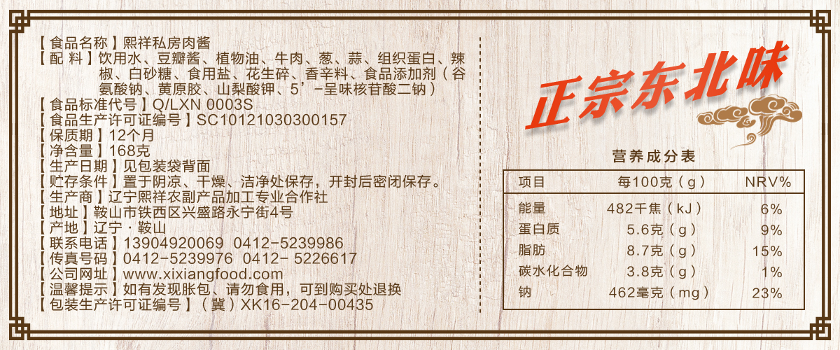 飲用水、植物油、豆瓣醬、牛肉、蔥、蒜、組織蛋白、辣椒、白砂糖、食用鹽、花生碎、香辛料、食品添加劑(谷氨酸鈉、山梨酸鉀、黃原膠、5-呈味核苷酸二鈉)