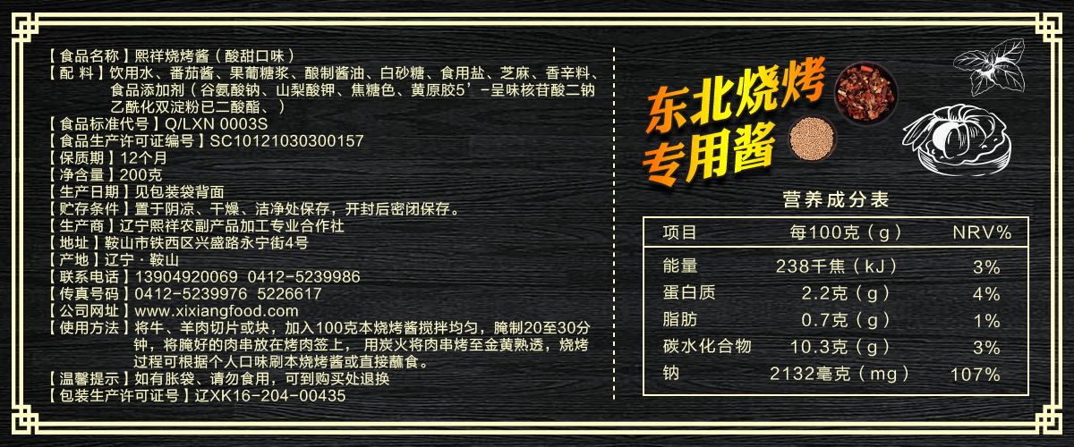 • 配料:飲用水、番茄醬、果葡糖漿、釀制醬油、白砂糖、食用鹽、芝麻、香辛料、食品添加劑(谷氨酸鈉、山梨酸鉀、黃原膠、5-呈味核苷酸二鈉、乙?;p淀粉乙二酸酯)