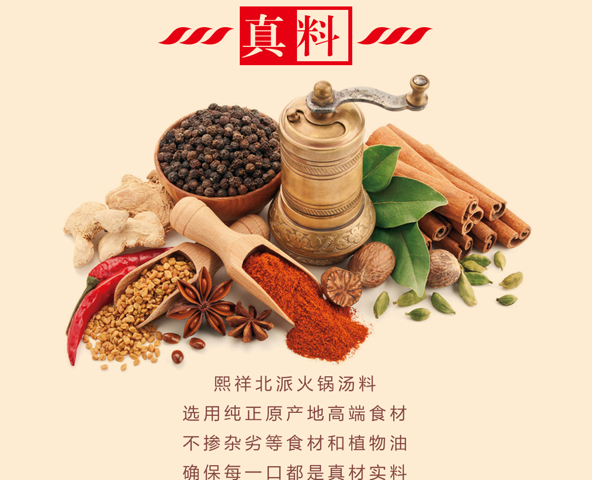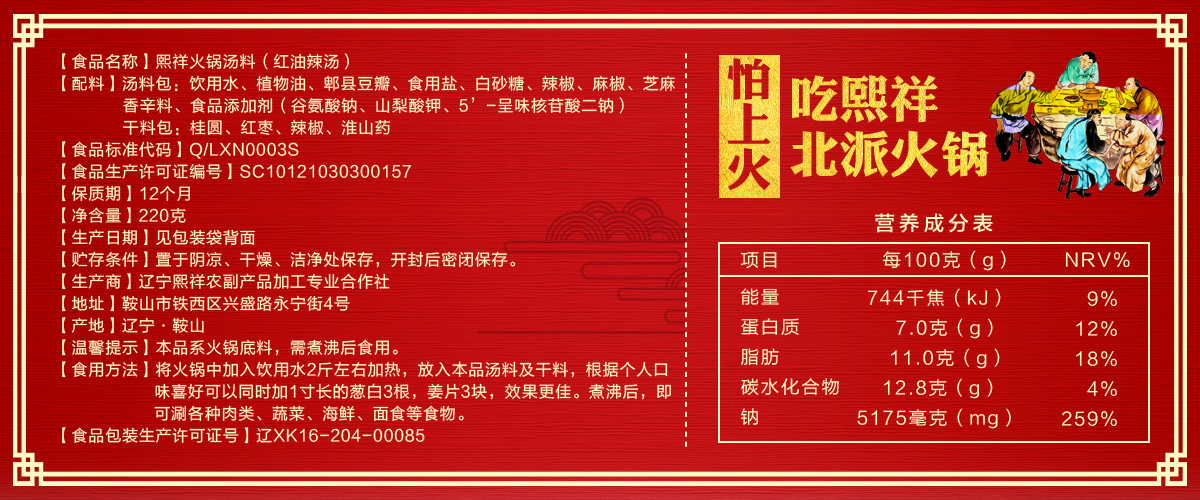 • 配料:湯料包:飲用水、植物油、郫縣豆瓣、食用鹽、白砂糖、辣椒、麻椒、芝麻、香辛料、食品添加劑(谷氨酸鈉、山梨酸鉀、5-呈味核苷酸二鈉) 干料包:桂圓、紅棗、辣椒、香菇、淮山藥